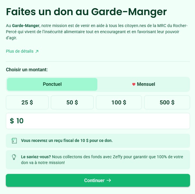 Vous pouvez effectuer un don ponctuel ou des dons à chaque mois. Tous les dons sont bienvenus. Vous souhaitez contribuer? Rendez-vous sur notre page Zeffy en cliquant sur le bouton ci-dessous.